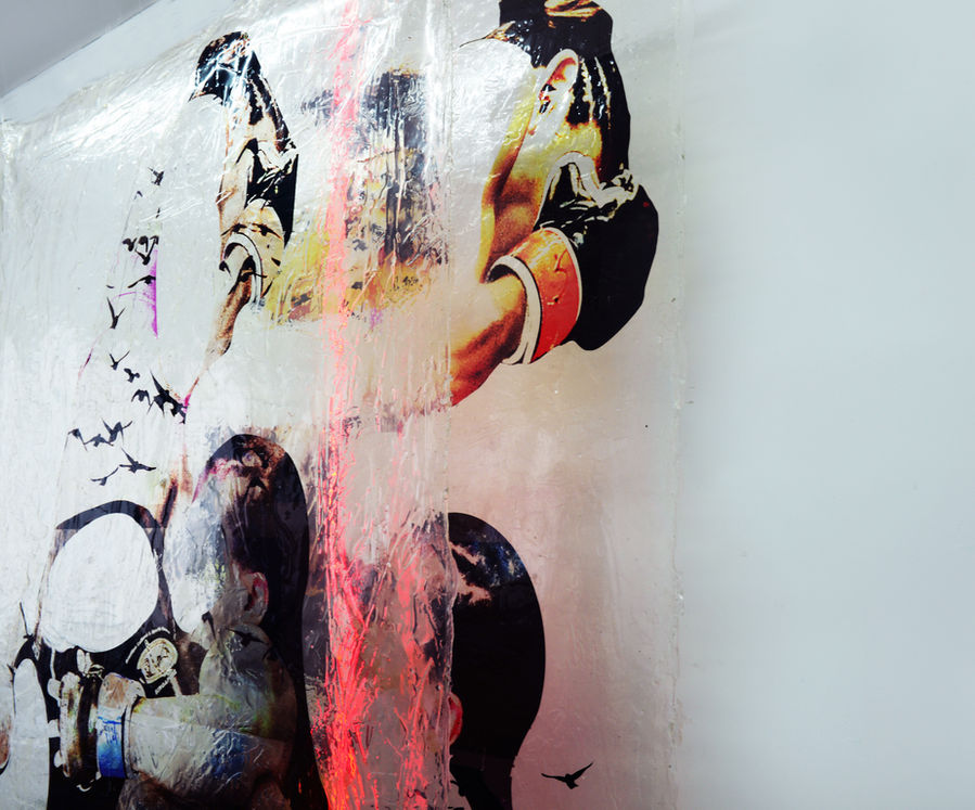 LUT is an installation consisting of multiple prints on a transparent and flexible medium, suspended in layers within the space. Transparent silicone, acrylic paint, flexible neon tube, 160 x 50 x 180 cm, 2022.